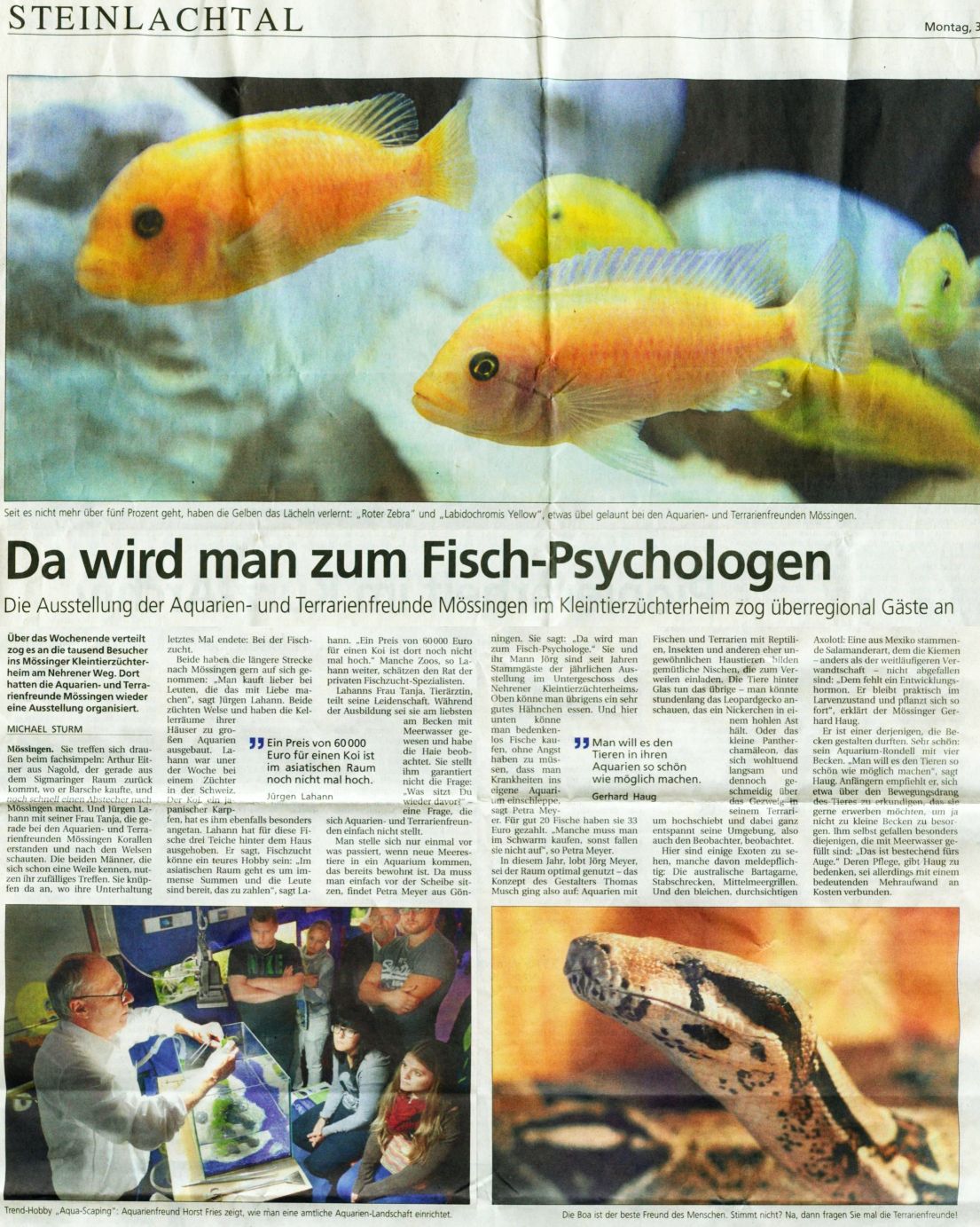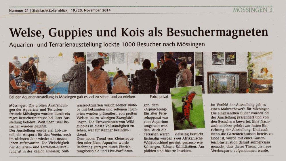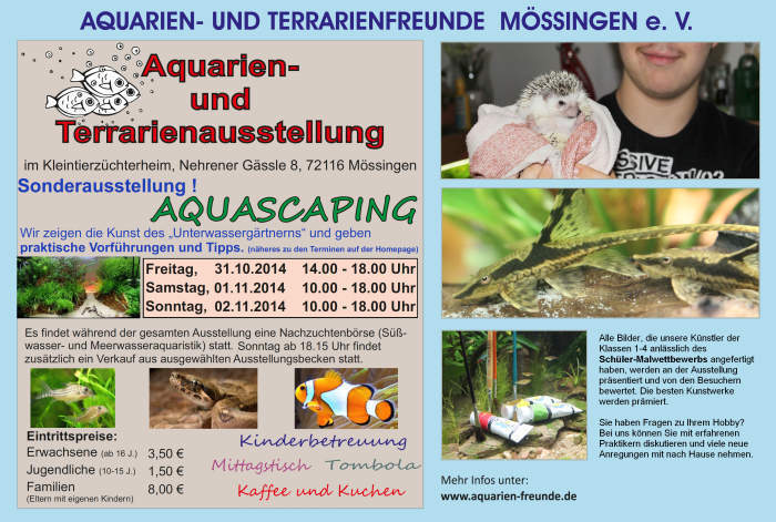 Weit über 1000 Besucher interessierten sich für unsere Ausstellung. Fachsimpeln in lockerer Athmosphäre mit erfahrenen Aquarianern und Terrarianern war ebenso angesagt wie einfach sich Erfreuen an der bunten Welt der Zierfische und den bizarren Terrarientieren. Unsere reich bestückte Tombola war ein ständiger Besuchermagnet. Kinderbetreuung im eigenen Bereich wurde von Familien besonders geschätzt. Für das leibliche Wohl unserer Gäste sorgten wie immer die Kleintierzüchter in bewährter Weise.